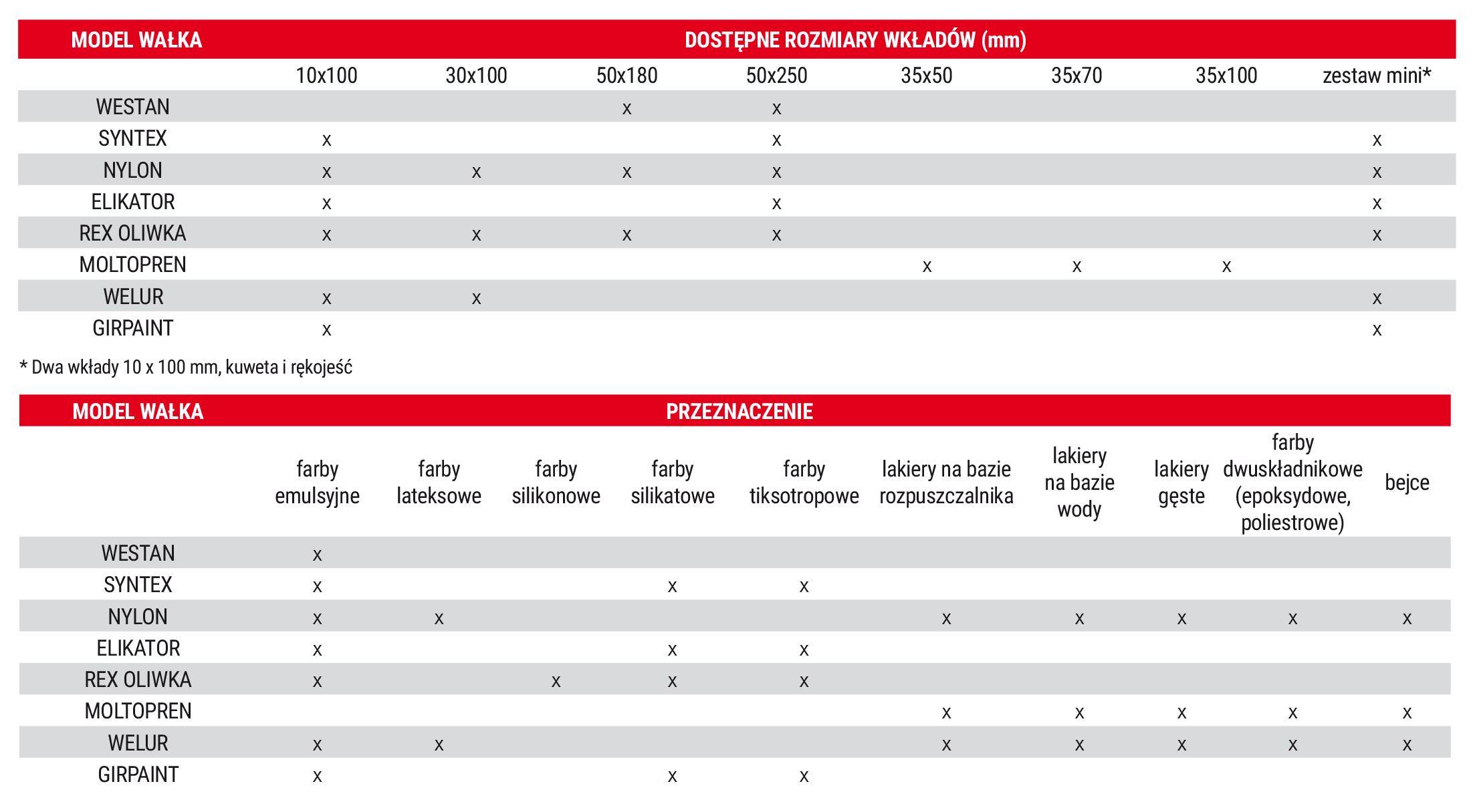 mieszanym zarówno do farb wodorozcieńczalnych jak i farb olejnych, lakierów. Wałki - wysokość runa powinna być dobrana do struktury malowanej powierzchni. Krótkie runo zdecydowanie lepiej sprawdza się do malowania bardzo gładkich powierzchni takich jak np. gładź gipsowa. Im bardziej strukturalna, porowata powierzchnia tym wałek powinien mieć dłuższe runo, dlatego też do malowania elewacji i fasad zaleca się wałki o bardzo długim runie. Ważny jest także materiał (poszycie), z którego wykonany jest wałek. Przeznaczenie wszystkich wałków PROLINE przedstawia powyższa tabela.