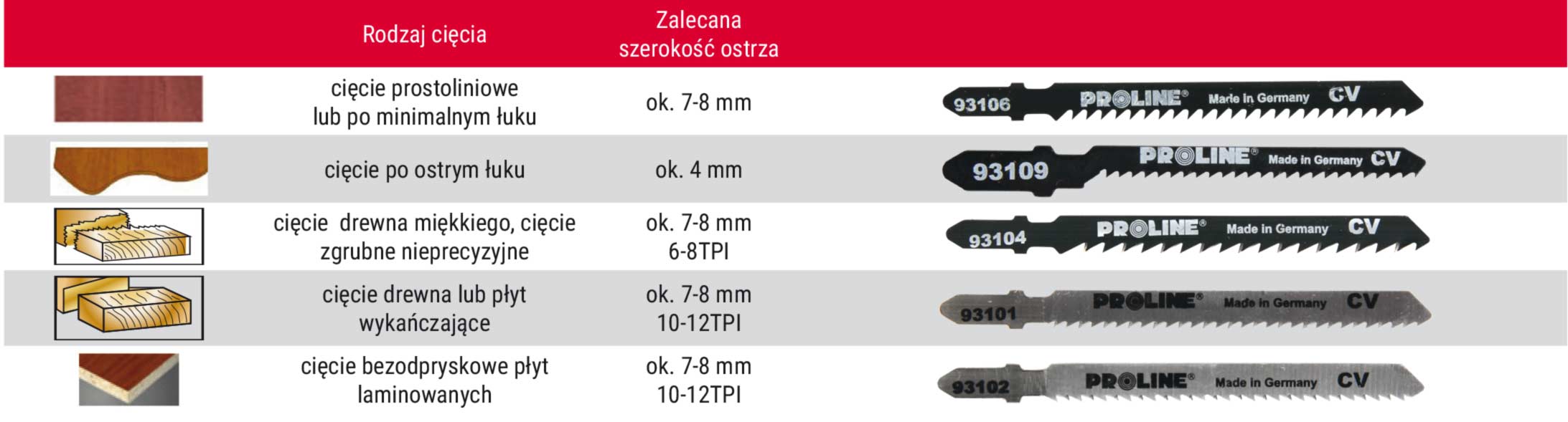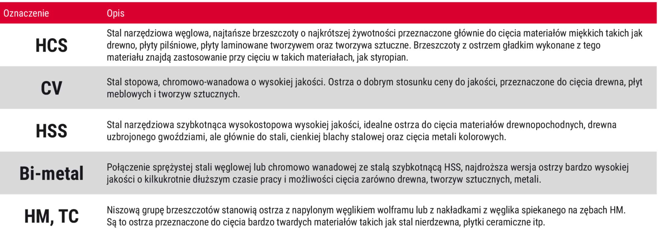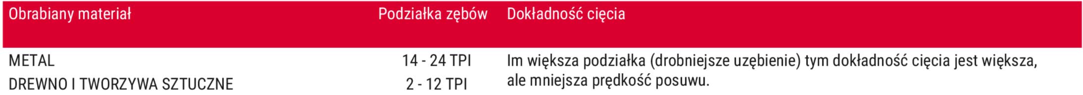 (czyli podziałki uzębienia TPI - ilość zębów na cal długości brzeszczotu (1 cal = 25,4mm))